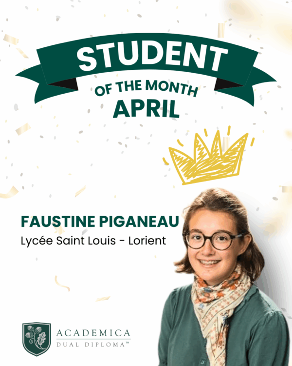 Chaque mois, Academica International Studies décerne à un élève du Dual Diploma Program™ le prestigieux titre de Student of the Month, une récompense qui souligne l’engagement académique et personnel exceptionnel parmi plus de 38 000 élèves internationaux.Pour ce mois d’avril, nous avons l’immense plaisir d’annoncer que Faustine Piganeau, élève française du Lycée Saint Louis à Lorient,… Lire la suite